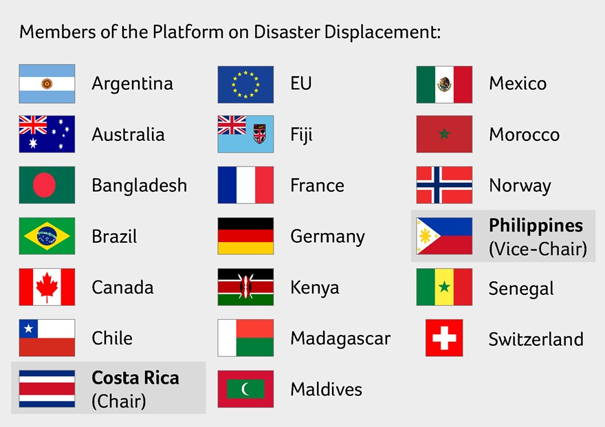 The Steering Group contains between 15 and 25 members consisting of UN Member States and regional organizations, represented through their Permanent Missions/Delegations in Geneva, and its composition aims to reflect a wide and balanced geographic representation. The Office of the United Nations High Commissioner for Refugees (UNHCR) and the International Organization for Migration (IOM) are standing invitees to the Steering Group and the United Nations Office for Project Services (UNOPS) is member ex officio, hosting the PDD Secretariat.