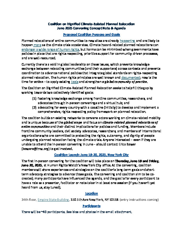 More than 40 community leaders, advocates, and researchers from across the globe convened in New York City on 19–20 June 2025 for the launch of the Coalition on Dignified Climate-related Planned Relocation. The convening was hosted in the Human Rights Watch New York Office, with generous support from the Robert Bosch Stiftung, and contributions from the PDD and its Advisory Committee members. It marked the beginning of a new global alliance dedicated to ensuring that communities facing climate-related planned relocation can do so on their own terms, with dignity and full respect for human rights.